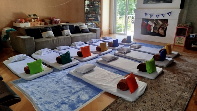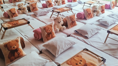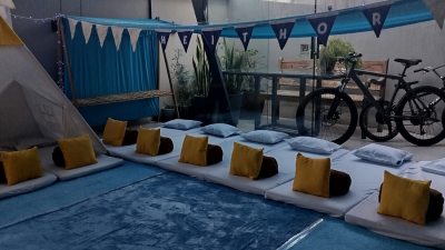 A tenda coletiva oferece um ambiente confortável e lúdico, ideal para crianças dormirem juntas, favorecendo atividades, convivência, criatividade e memórias afetivas.