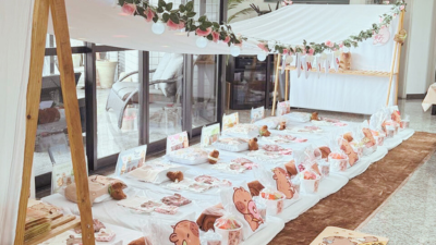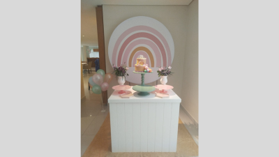 A mesa retangular é perfeita para quem dispõe de pouco espaço, oferecendo praticidade sem abrir mão de uma decoração charmosa e funcional. Ideal para a mesa do parabéns e composições delicadas.