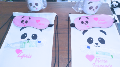Este kit de lembrancinhas composto de sacolinhas, máscara de dormir e copo é a lembrancinha ideal para uma festa do pijama mais divertida